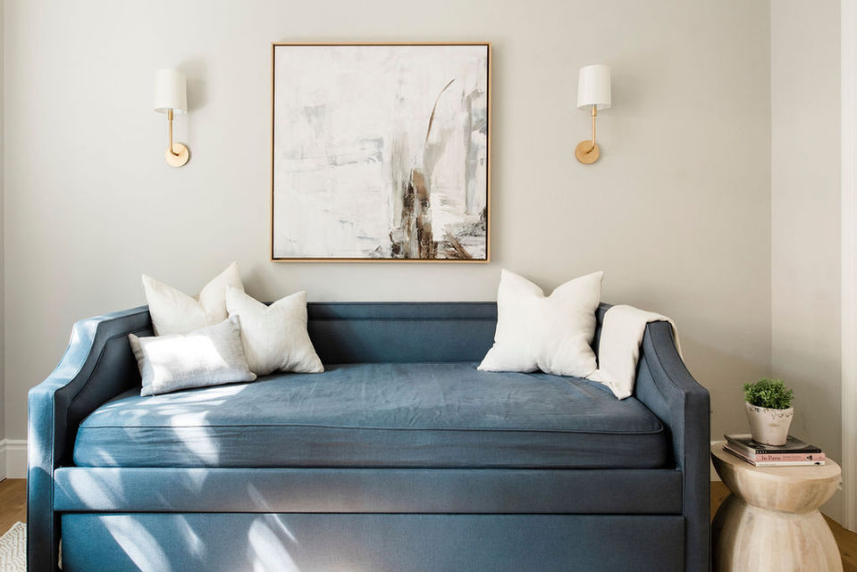 Our Project Danielle client wanted a bedroom refresh, but wanted to keep her bed, TV placement and skip new paint, so I designed around what she had. She also was interested in unique real art signed by the artist so I sourced these beautiful watercolor paintings from Chelsey Fly. In addition, she needed a home office that felt comfortable, stylish and fit within her guest bedroom. She didn't want it to obviously look like a guest bedroom so I did a custom daybed from Liven Up design with Schumacher fabric.